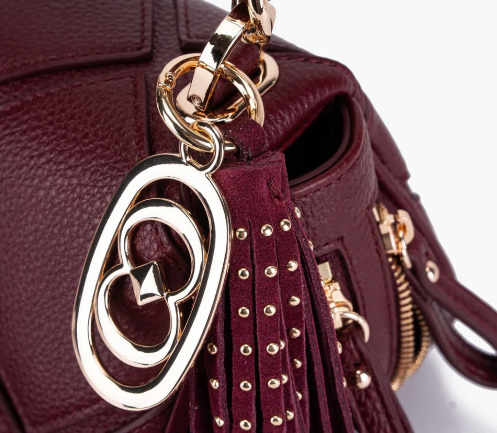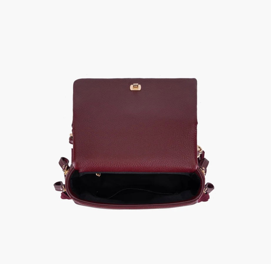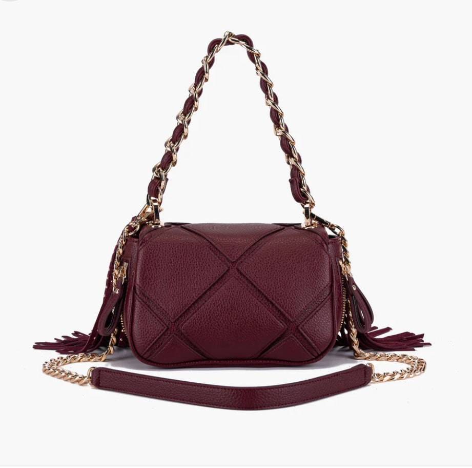 Borsa in ecopelle trapuntata con frange e manico in catena rivestita, tracolla in catena rimovibi