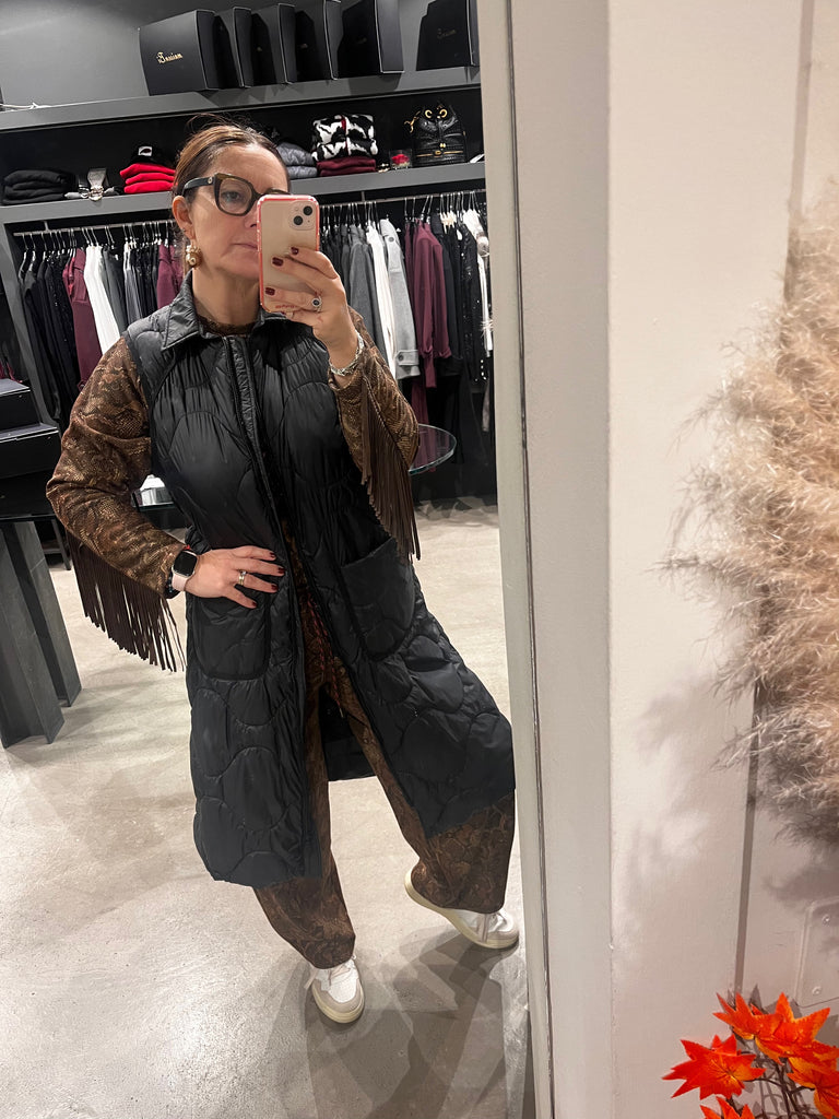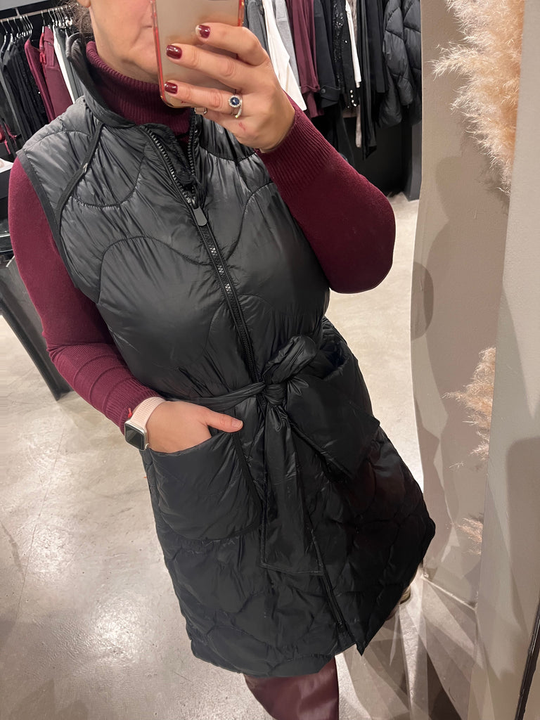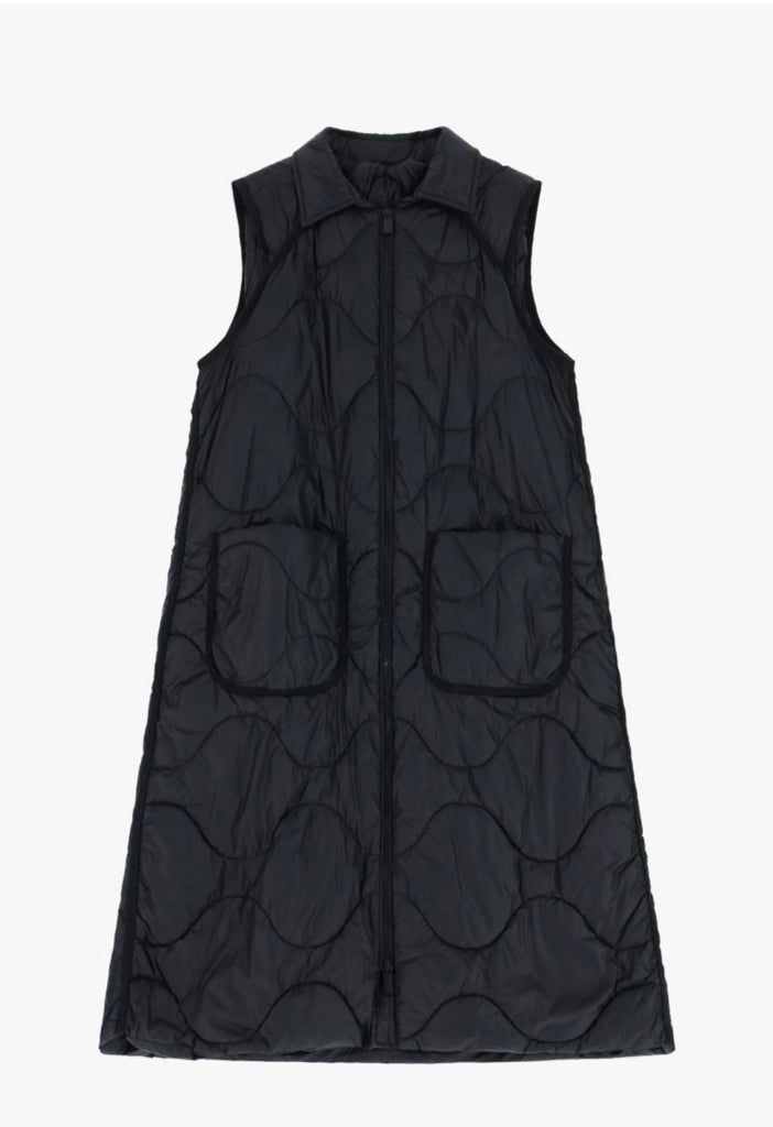 Piumino trapuntato lungo senza maniche con tasche esterne e cintura